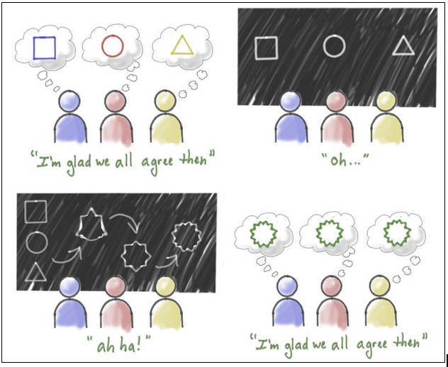 Les coachs agiles proposent en général l’utilisation d’artefacts visuels lors des différents ateliers collaboratifs, et ce n’est pas pour rien ! On met en place des éléments de Kanban et Scrum au mur, on utilise un tableau velleda ou un “flip chart” lors des rituels, on affiche des indicateurs faciles à comprendre sur le plateau projet, on ne lésine pas sur les post-its, etc. La compréhension collective d’un concept ou d’un système est plus intéressante lorsqu’elle est visible et modulable dans l’endroit où on collabore. On le comprend en voyant la planche qu’on retrouve dans le bouquin user story mapping de Jeff Patton.